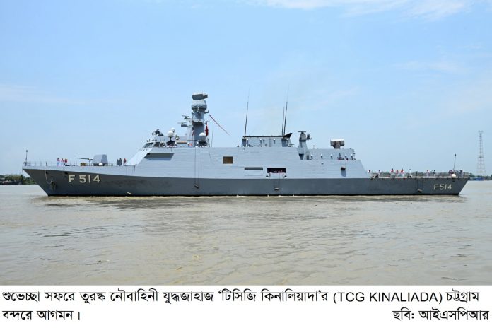 তিন দিনের শুভেচ্ছা সফরে বাংলাদেশে এসে পৌঁছেছে তুরস্ক নৌবাহিনীর জাহাজ ‘টিসিজি কিনালিয়াদা’ (TCG KINALIADA)। আজ মঙ্গলবার (০৭-০৫-২০২৪) জাহাজটি চট্টগ্রাম বন্দর জেটিতে এসে পৌঁছালে কমান্ডার চট্টগ্রাম নৌ অঞ্চলের চিফ স্টাফ অফিসার ক্যাপ্টেন এম আসাদুজ্জামান জাহাজটিকে স্বাগত জানান। এ সময় নৌবাহিনীর সুসজ্জিত বাদকদল ঐতিহ্যবাহী রীতিতে ব্যান্ড পরিবেশন করে। জাহাজটিকে স্বাগত জানাতে অন্যান্যদের মধ্যে বাংলাদেশে নিযুক্ত তুরস্ক হাইকমিশনের প্রতিনিধিসহ নৌবাহিনীর পদস্থ কর্মকর্তা ও নাবিকগণ উপস্থিত ছিলেন।
