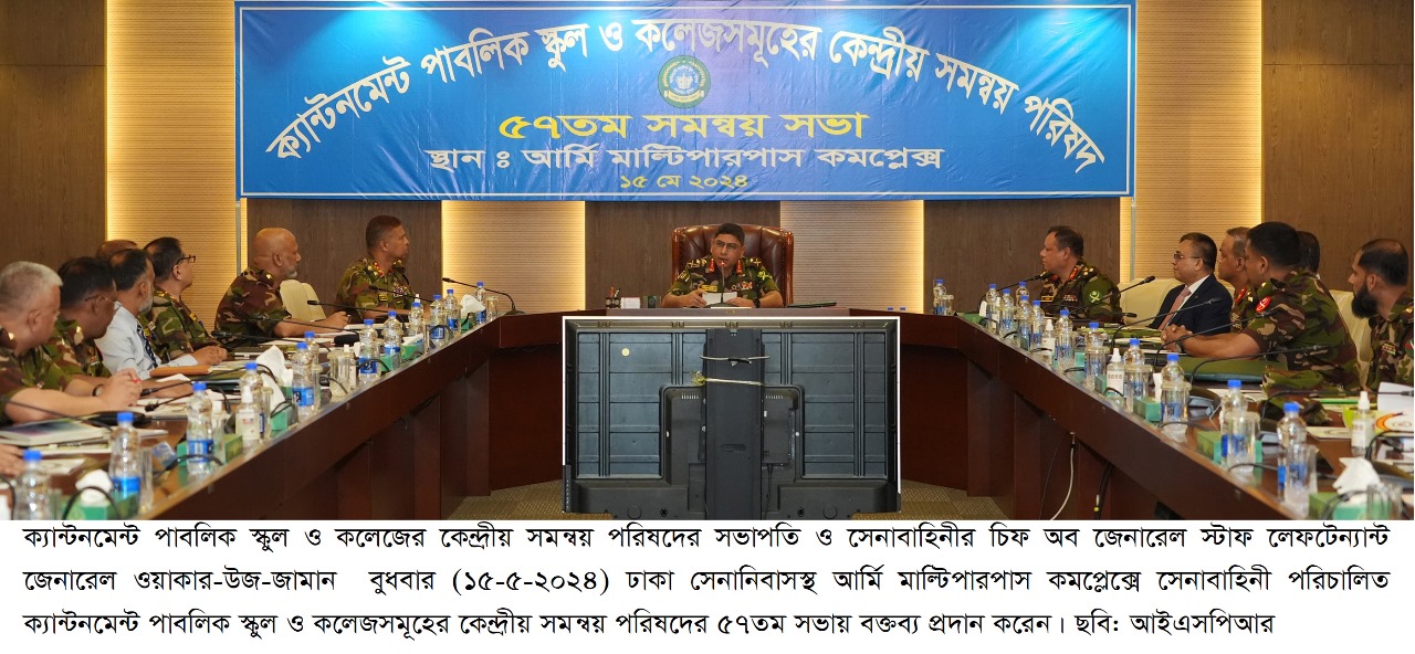 বাংলাদেশ সেনাবাহিনী পরিচালিত ৪৪টি ক্যান্টনমেন্ট পাবলিক স্কুল ও কলেজের কেন্দ্রীয় সমন্বয় পরিষদের সভা অনুষ্ঠিত হয়েছে। বুধবার (১৫-৫-২০২৪) আর্মি মাল্টিপারপাস কমপ্লেক্স, ঢাকা সেনানিবাসে অনুষ্ঠিত হয়। উক্ত সমন্বয় সভায় ক্যান্টনমেন্ট পাবলিক স্কুল ও কলেজের কেন্দ্রীয় সমন্বয় পরিষদের সভাপতি ও বাংলাদেশ সেনাবাহিনীর চিফ অব জেনারেল স্টাফ লেফটেন্যান্ট জেনারেল ওয়াকার-উজ-জামান, ওএসপি, এসজিপি, পিএসসি প্রধান অতিথি হিসেবে উপস্থিত ছিলেন।
