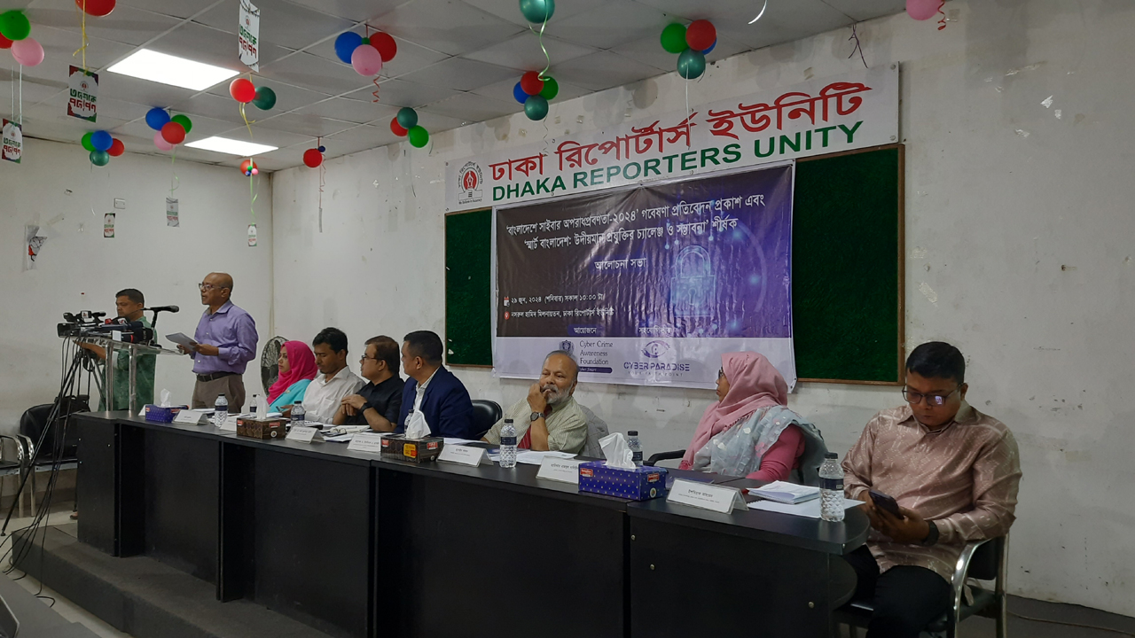 শনিবার (২৯ জুন) রাজধানীর ঢাকা রিপোর্টার্স ইউনিটির নসরুল হামিদ মিলনায়তনে অনুষ্ঠিত ‘বাংলাদেশে সাইবার অপরাধপ্রবণতা-২০২৪’ এবং ‘স্মার্ট বাংলাদেশ: উদীয়মান প্রযুক্তির চ্যালেঞ্জ ও সম্ভাবনা’ শীর্ষক আলোচনা সভায় এ গবেষণা প্রতিবেদন তুলে ধরে সাইবার ক্রাইম অ্যাওয়ারনেস ফাউন্ডেশনের উদ্যোগ (সিক্যাফ)।
