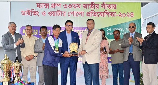 বাংলাদেশ সুইমিং ফেডারেশনের ব্যবস্থাপনায় ‘ম্যাক্স গ্রুপ ৩৩তম জাতীয় সাঁতার, ডাইভিং ও ওয়াটারপোলো প্রতিযোগিতা-২০২৪’ এর সমাপনী ও পুরস্কার বিতরণী অনুষ্ঠান আজ মঙ্গলবার (১২-১১-২০২৪) ঢাকার মিরপুরস্থ সৈয়দ নজরুল ইসলাম জাতীয় সুইমিং কমপ্লেক্সে অনুষ্ঠিত হয়। উক্ত অনুষ্ঠানে সহকারী নৌবাহিনী প্রধান (পার্সোনেল) রিয়ার এডমিরাল মোহাম্মদ মুসা প্রধান অতিথি হিসেবে উপস্থিত থেকে বিজয়ীদের মাঝে পুরস্কার বিতরণ করেন। প্রধান অতিথি তাঁর ভাষণে প্রতিযোগিতায় অংশগ্রহণকারী সাঁতারুদের যথাযথ প্রশিক্ষণের মাধ্যমে নিজেদেরকে আরও দক্ষ সাঁতারু হিসেবে গড়ে তোলার আহ্বান জানান, যাতে আন্তর্জাতিক পর্যায়ে প্রতিযোগিতায় অংশগ্রহণ করে দেশ ও জাতির সুনাম বয়ে আনতে পারে। সমাপনী অনুষ্ঠানে অন্যান্যের মধ্যে সেনা, নৌ ও বিমান বাহিনীর উচ্চপদস্থ কর্মকর্তাগণ, বাংলাদেশ সুইমিং ফেডারেশনের কর্মকর্তাবৃন্দ, ম্যাক্স গ্রুপের চেয়ারম্যান এবং অংশগ্রহণকারী সাঁতারুসহ সাধারণ দর্শক উপস্থিত ছিলেন।