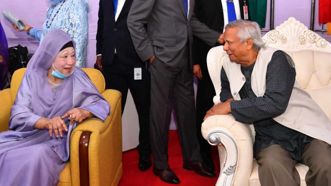 অনুষ্ঠানে পাশাপাশি সোফায় বসা ড. মুহাম্মদ ইউনুস ও খালেদা জিয়াকে হাস্যোজ্জ্বল মুখে আলাপচারিতা করতে দেখা গেছে। এর আগে বিকাল সাড়ে ৩টার দিকে খালেদা জিয়া তার গুলশানের বাসভবন ফিরোজা থেকে রওনা দিয়ে পৌনে ৪টার দিকে সেনাকুঞ্জে পৌঁছান।