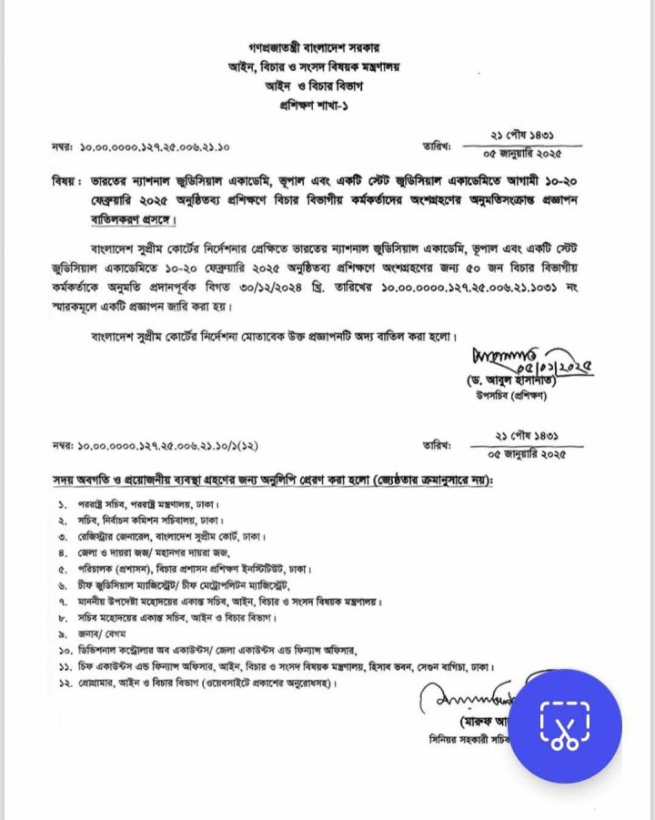 প্রজ্ঞাপনে বলা হয়, ভারতের ন্যাশনাল জুডিসিয়াল অ্যাকাডেমি, ভূপাল এবং একটি স্টেট জুডিসিয়াল অ্যাকাডেমিতে আগামী ১০-২০ ফেব্রুয়ারি অনুষ্ঠিতব্য প্রশিক্ষণে বিচার বিভাগীয় কর্মকর্তাদের অংশগ্রহণের জন্য ৫০ জন বিচার বিভাগীয় কর্মকর্তার অনুমতি সংক্রান্ত প্রজ্ঞাপন বাতিল করা হলো।