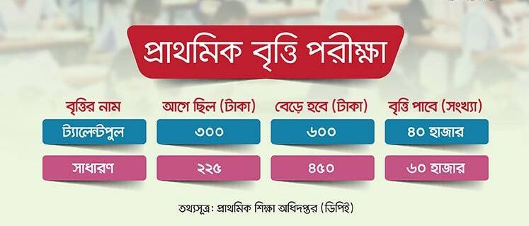 প্রাথমিক শিক্ষা অধিদপ্তরের মহাপরিচালক (ডিজি) আবু নূর মো. শামসুজ্জামান বলেন, ‘বর্তমানে দেশে প্রায় এক কোটি শিক্ষার্থী সরকারি প্রাথমিক বিদ্যালয়ে পড়ালেখা করছে। সেই হিসাবে ১ শতাংশ শিক্ষার্থীকে বৃত্তি দিলেও তা ১ লাখ হওয়া উচিত। সেজন্য আমরা আরও বেশি শিক্ষার্থীকে বৃত্তি দিতে সুপারিশ করেছি। সবশেষ সাড়ে ৮২ হাজার শিক্ষার্থী বৃত্তি পেয়েছিল। আগামীতে সেটি ১ লাখ বা তারও বেশি হতে পারে।’