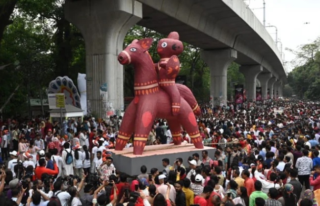 বর্ণিল এই আয়োজনে রয়েছেন চারুকলার শিক্ষার্থী, শিক্ষক ও সাধারণ মানুষ। তাদের হাতে শোভা পাচ্ছে জাতীয় পতাকা, বিভিন্ন মুখোশ, মোটিফ, যা পুরো আয়োজনে এনেছে এক উদ্দীপ্ত আবহ। রাজু ভাস্কর্য, দোয়েল চত্বর ও বাংলা একাডেমি প্রদক্ষিণ করে পুনরায় চারুকলায় ফিরে আসবে শোভাযাত্রাটি।